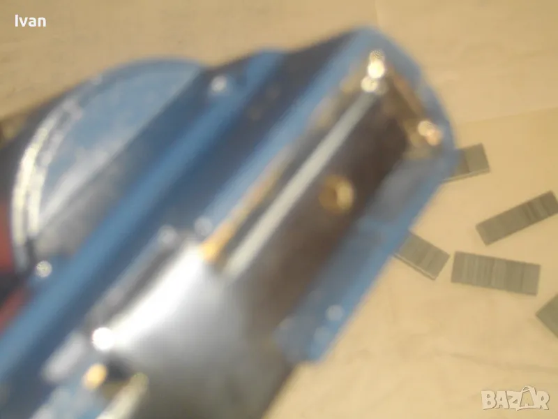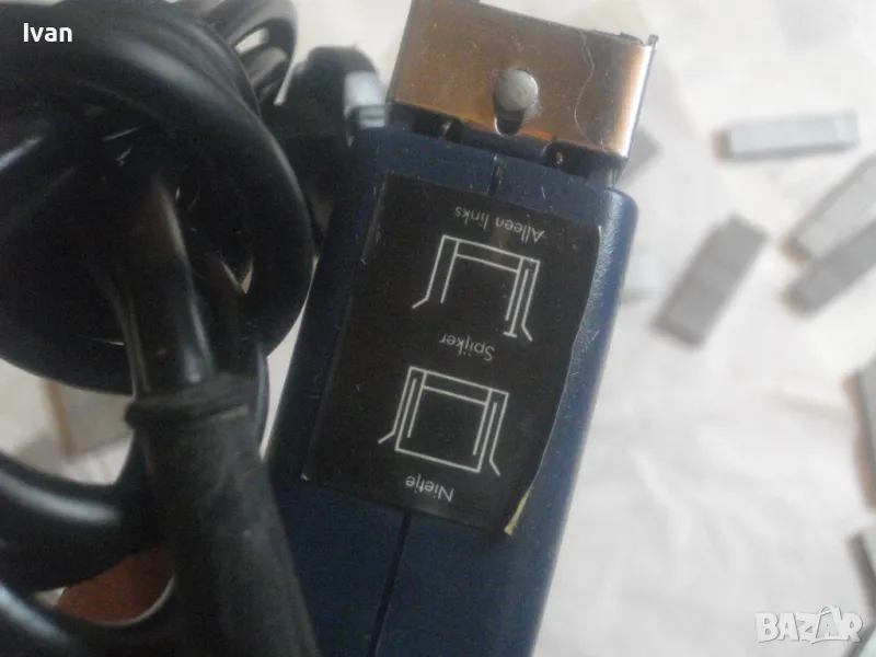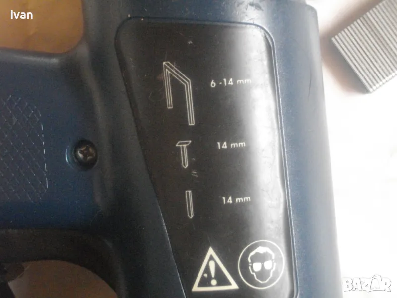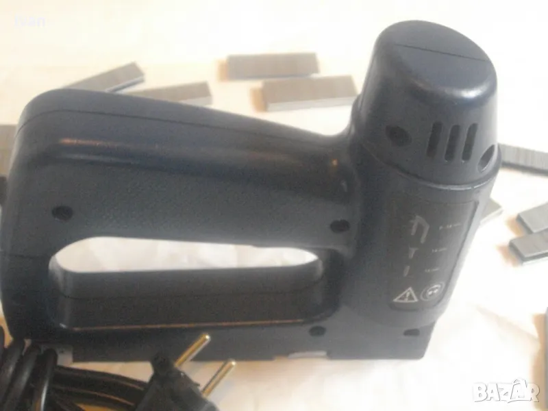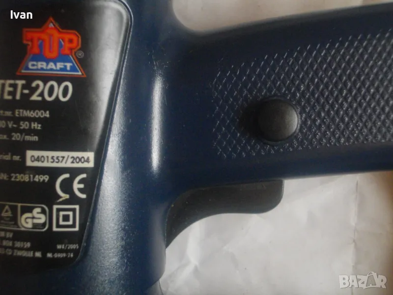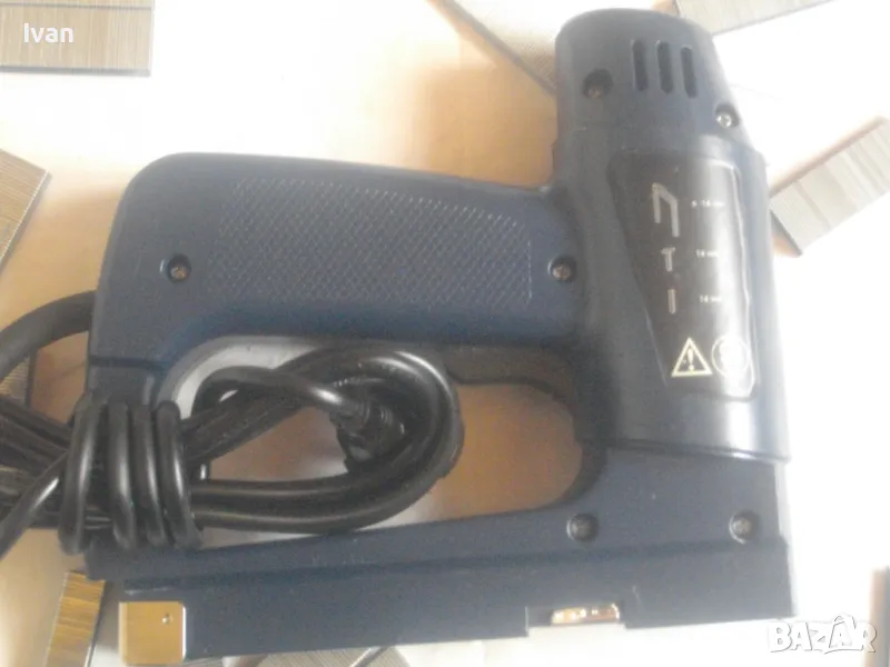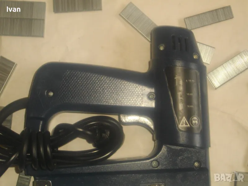 Такер тъмносин електрически TOP CRAFT TET 200. Холандски нидерландски оригинален, вписано на фабричния стикер. Производител маркиран FERM B.V. 2005 г. Комбиниран - за скоби 6-14 мм и пирони 14 мм и игли размер 14 мм. Като нов, много запазен външен вид, без драскотина и в отлично работно състояние. Без забележки. Масивен корпус от твърда пластмаса с релефна, нехлъзгаща се дръжка. Размери 180 х 200 х 50 мм. Автозащита на спусъка. Заредени скоби в пълнитееля за проба и тест. Тегло - 1,0 кг.