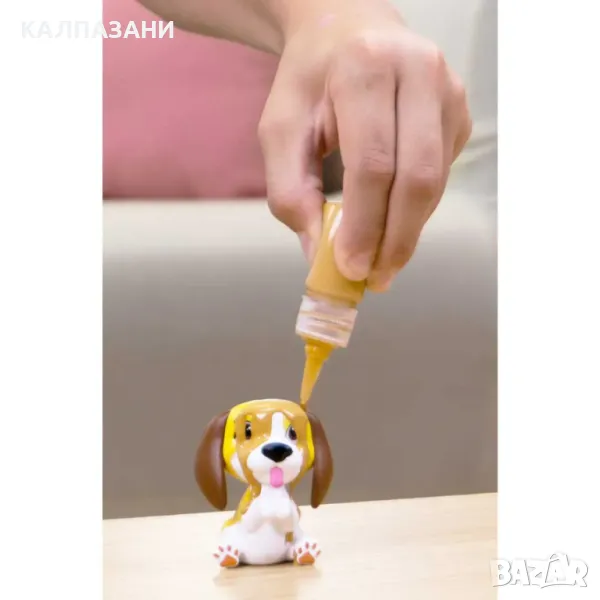 Съдържа: 2 фигурки кучета, джакузи/фото студио, мини четка, гумено пате, гъба за баня, "соли" за вана, кърпа, бутилка с кал.