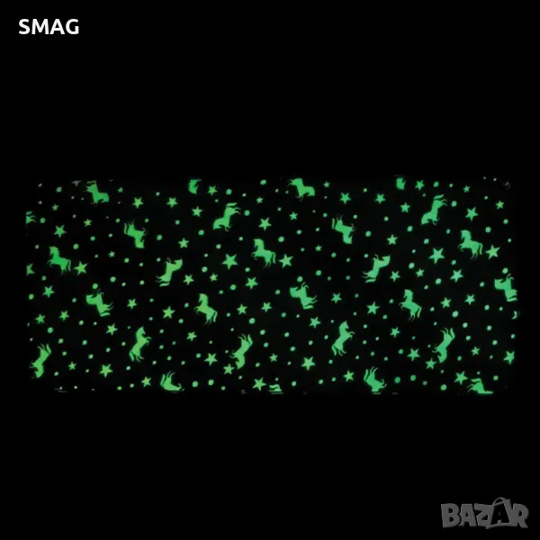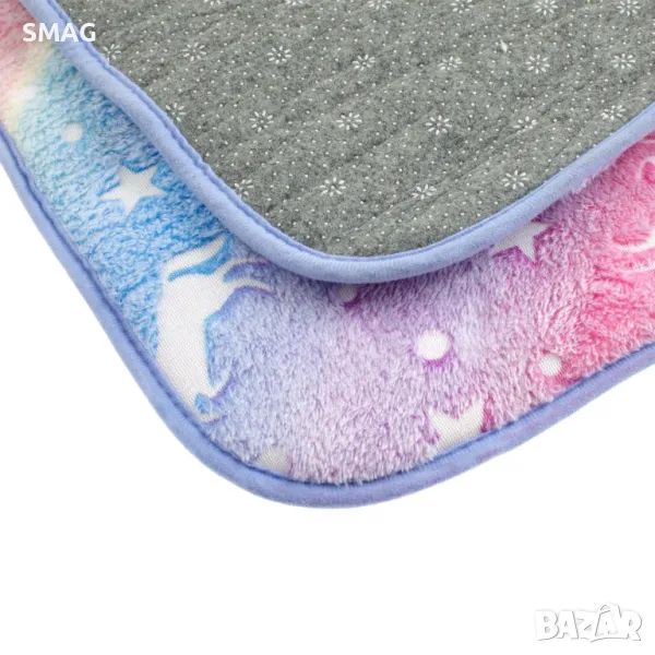 Правоъгълна декоративна постелка с противоплъзгаща повърхност на дъното. Има дизайн на еднорог, който поглъща светлина за 1 час и свети през следващите 8 часа. Идеална декорация за детска стая.
