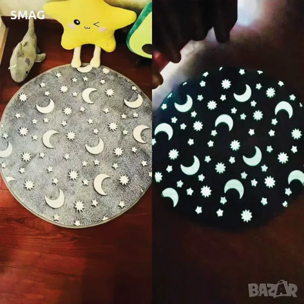 Декоративна кръгла постелка с противоплъзгаща повърхност на дъното. Има дизайн на луна и звезда, които поглъщат светлина за 1 час и светят през следващите 8 часа. Идеална декорация за детска или възрастна стая, както и за вашия хол.
