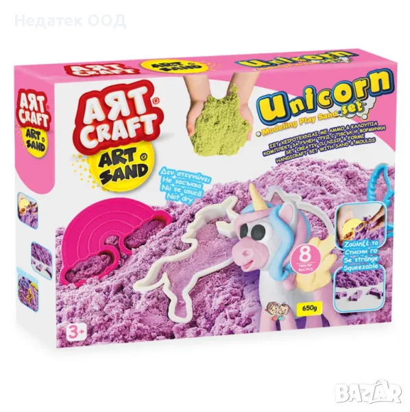 650 г лилав пясъчен комплект за изработка и пластмасови форми с цвят на еднорог и дъга. Пясъкът не изсъхва и с формичките детето прави красиви форми. Обогатява въображението, подобрява двигателните умения и развива сетивата.