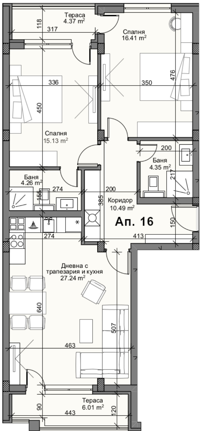 Апартаментите са изпълнени по най-висок строителен стандарт,с панорамни тераси, трислоен стъклопакет SCHUCO и вентилируема фасада.
