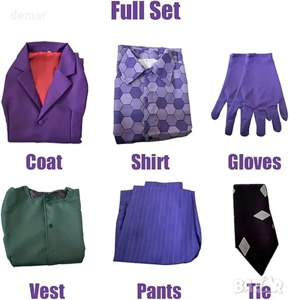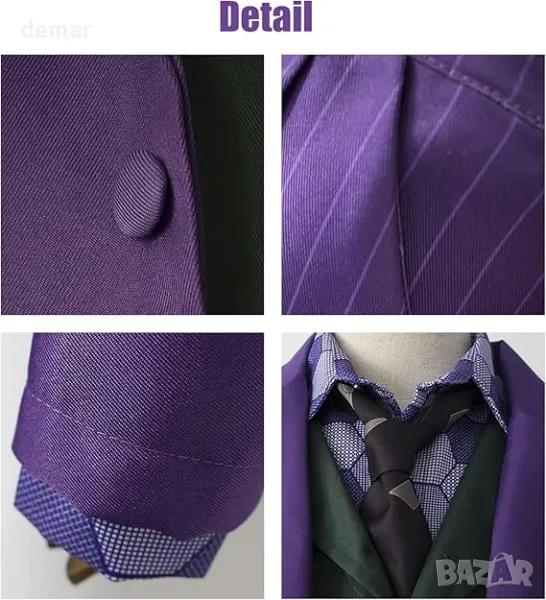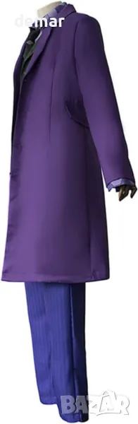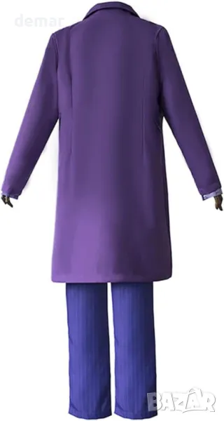Този костюм на Жокер е идеален подарък за различни поводи, включително Хелоуин, тематични партита за рожден ден и семеен косплей, което го прави достатъчно универсален за ежедневно носене. Изработен от мек и удобен еднороден плат полиестер, той осигурява приятно изживяване при носене. Ансамбълът включва стилно лилаво сако, допълнено с палто, риза, ръкавици, жилетка, вратовръзка и панталон, идеални за костюмирани партита.