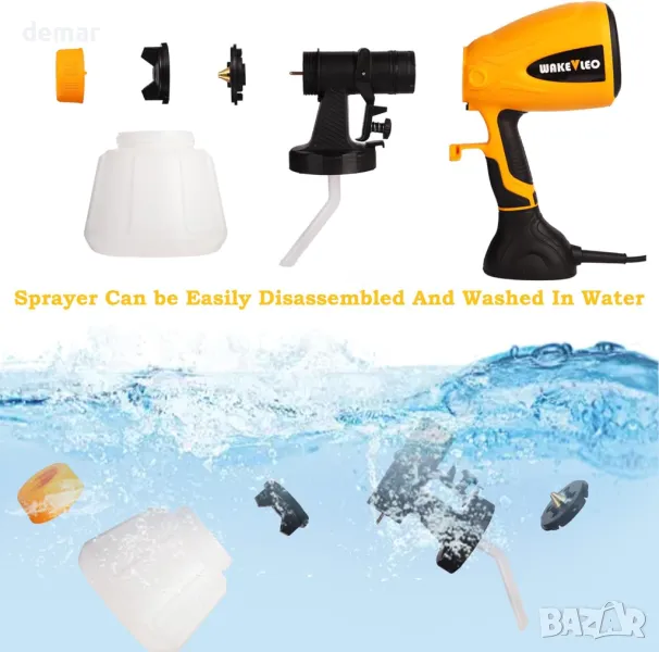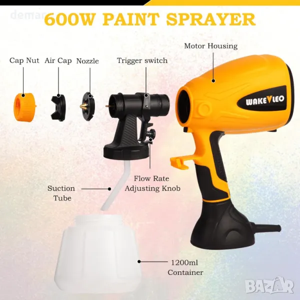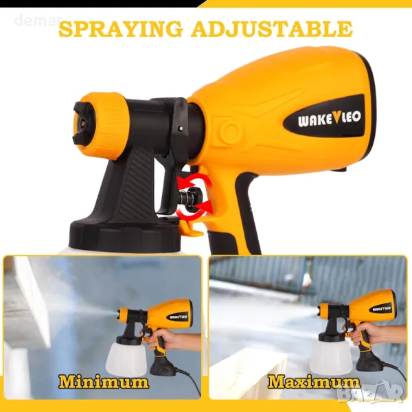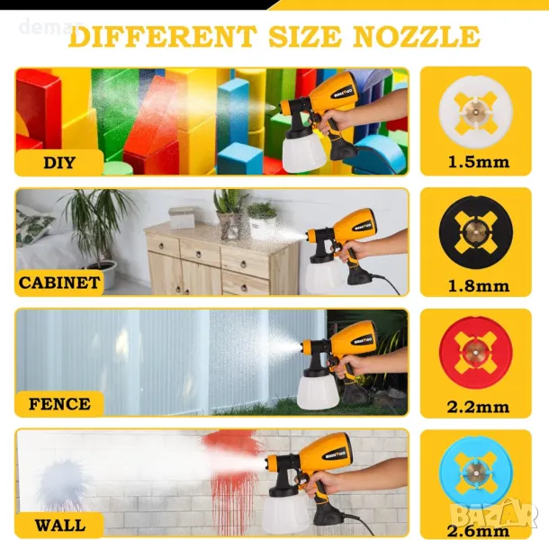 Пръскачка за боя WAKEVLEO 600 W, 3 регулируеми модели на пръскане, 4 размера на дюзите и 1200 ml