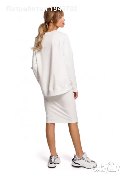 Пола тип молив в цвят екрю. Моделът е с цепка и кант с лого от едната страна. Полата е изработена от еластична материя. Дължина до коляно.