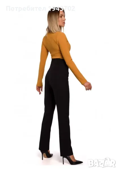 Дамски елегантен панталон в черен цвят. Моделът е с висока талия и декоративни копчета от двете страни. Панталонът е със странични джобове, прави крачоли и широк колан на талията. Покрит цип отстрани.