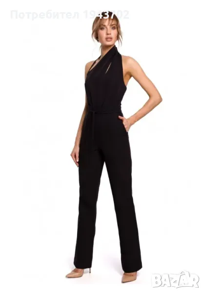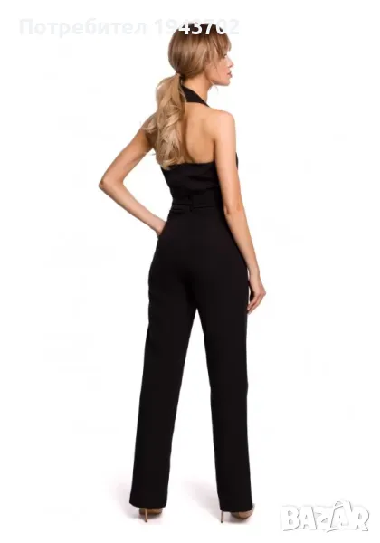Дамски елегантен гащеризон без ръкави в черен цвят. Моделът е с гол гръб, асиметрично деколте и прави крачоли със странични джобове. Гащеризонът е с колан на талията. Изключително женствен модел, който е перфектен за специални случаи.