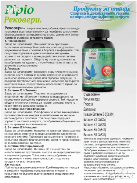 Като добавка продукта Рековери е предназначен да подпомага бързото възстановяване на птиците след боледуване ,полет,