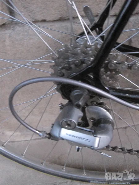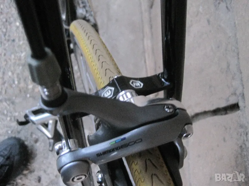 Оборотът 52/42 зъба,спирачките,спирачните ръкохватки и задният дерайльор са Shimano 600 tricolor 6400-03.