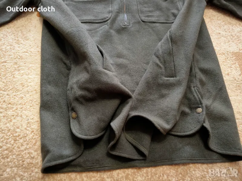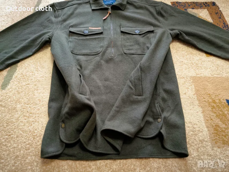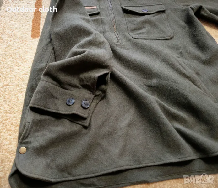 Една уникална дреха,риза-яке наподобява анорак. Направена от плътна вълнена материя 100% вълна Heavy Weight Wool.Може да се носи като яке и изолиращ слой.Има два джоба на гърдите и два долни,двойни копчета на маншетите на ръкавите,странични копчета долу при подгъва.