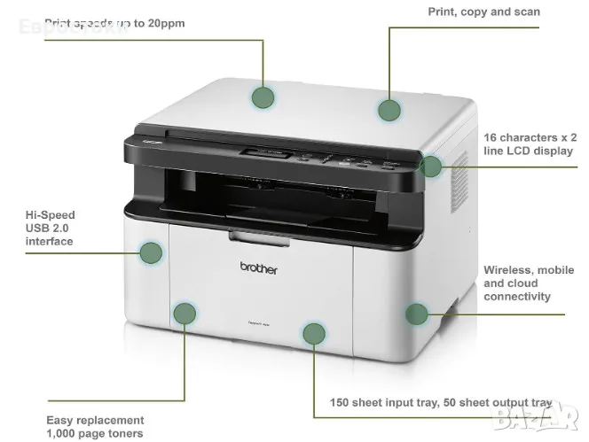 Идеален за дома или малкия офис, лазерен принтер DCP-1610W предлага отлично качество на печат. Освен това, има функцията за сканиране и копиране. Ако имате нужда от стабилно решение за печат, което може да се побере в най-тесните работни среди, това е правилната машина за тази работа.