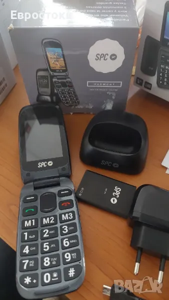 SPC Harmony - мобилен телефон с капак (флип), за възрастни с големи цифри и букви, двоен дисплей, SOS бутон, 3 директни памети, зарядна станция. Сиво