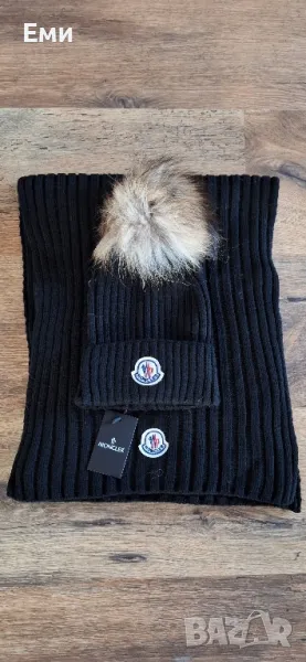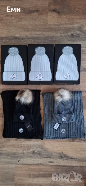 Комплекта шал и шапка на Moncler е в луксозна кутия на цена 60 лева.