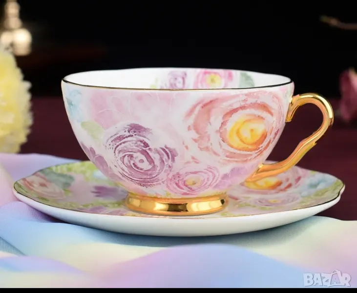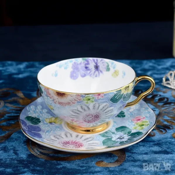 Уникални чаши - 280 мл. изработена от фин порцелан с иновативен, релефен, изключително красив и нежен, флорален декор включително, и вътрешната част на чашите. В допълнение златна дръжка, столче и златна, тематична лъжичка придаваща й завършен ефект.