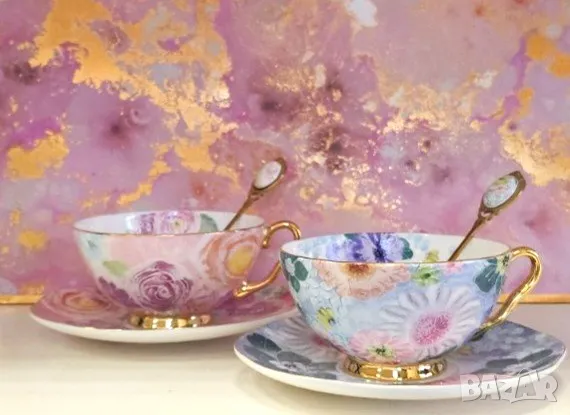 Комплект от две красиви чаши - 6 части с цветя в преобладаващо лилаво-син или розов цвят.