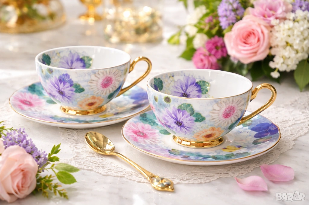 Комплект от две красиви чаши - 6 части с цветя в преобладаващо лилаво-син или розов цвят.