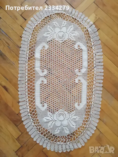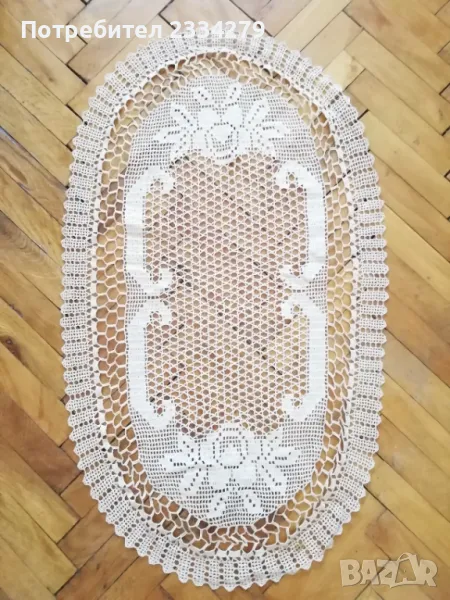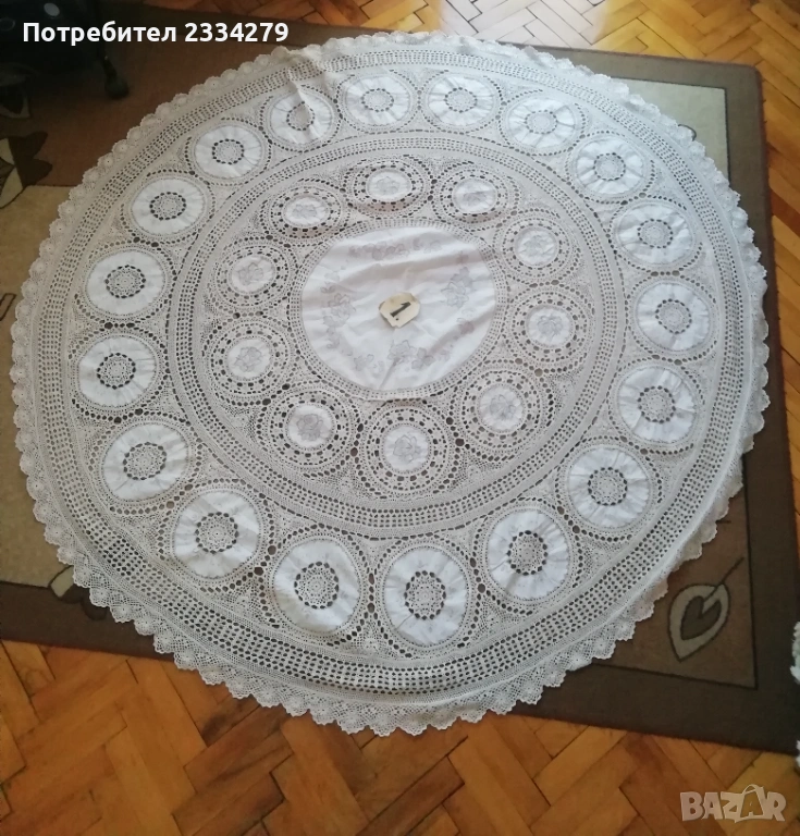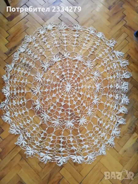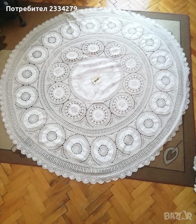 N:1 стара ръчно плетена покривка кръгла с размер: диаметър 1м.70см., цена 35€.; N:2 голяма ръчно плетена покривка за маса, легло, размери 2м.40см.Х1м.80см., цена 45€. Декорация за битова къща и други.; N:3 плетена ръчно на една кука покривка за маса: кръглата е с размери 1м.20см., цена 10€.; N:4 продълговата 90х50см., цена 8€. (викториански стил)