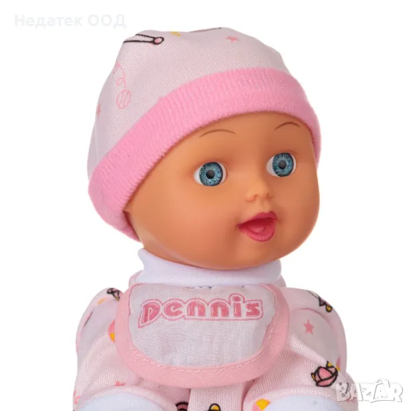 Очарователно бебе пълзи, танцува, смее се на музика и клати глава. Той казва "мама" и "татко". Тя носи дрехи с розови шарки, лигавник и шапка. Тя има шише и лилаво/розова залъгалка. Работи с 2 батерии АА (не са включени).
