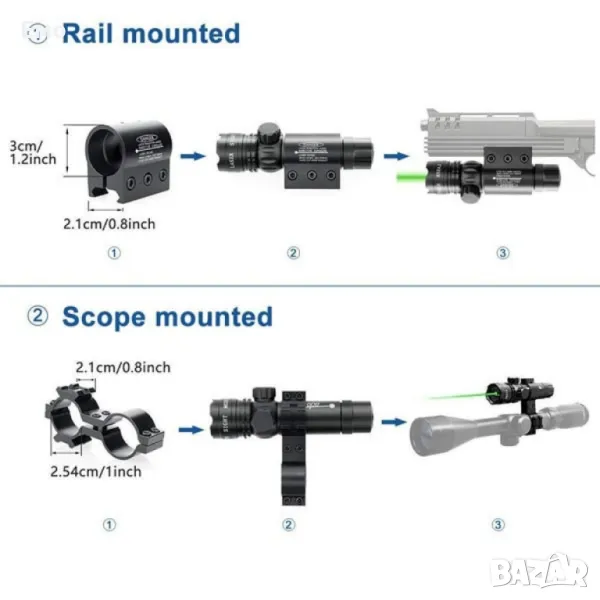 Лазерен цвят: Зелен. Захранване: Батерия и USB зареждане;Дължина на вълната: 532nm.