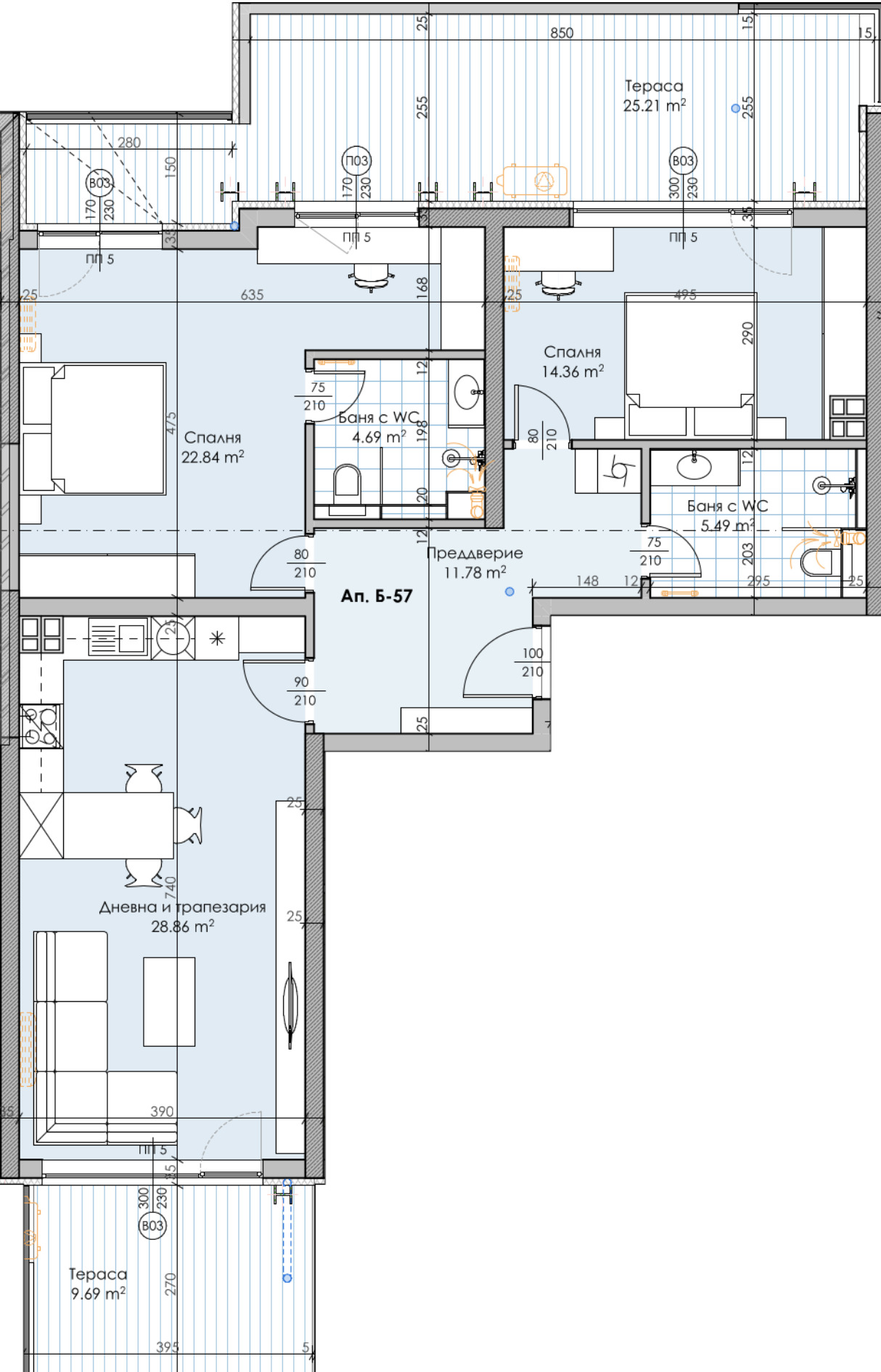 Апартаментът е с изложение юг-север секция Б, състоящ се от дневна с трапезария,2 спални, 2 бани с тоалетна, 2 лоджии.