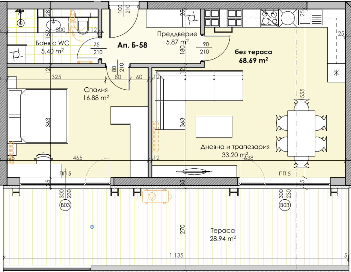 Апартаментът е с изложение юг, секция Б, състоящ се от дневна с трапезария, спалня, баня с тоалетна, лоджия