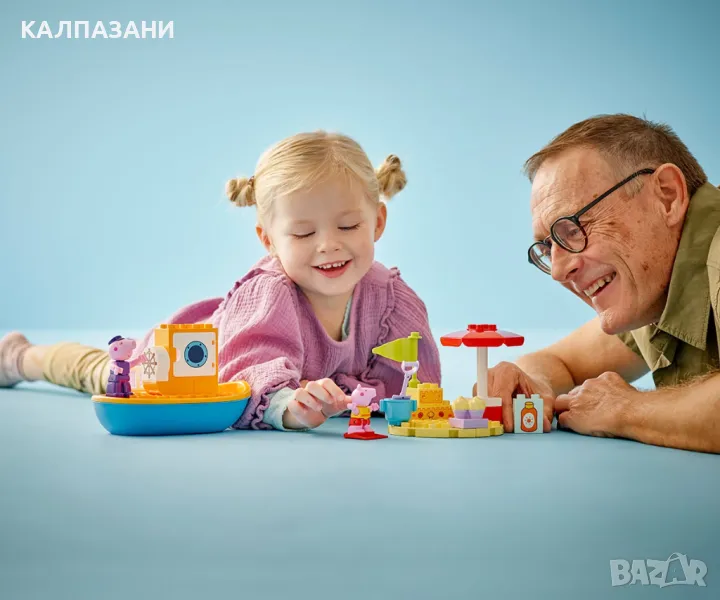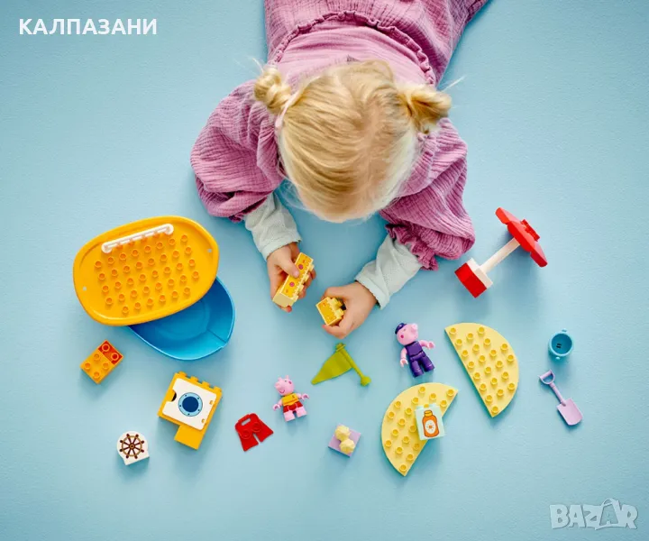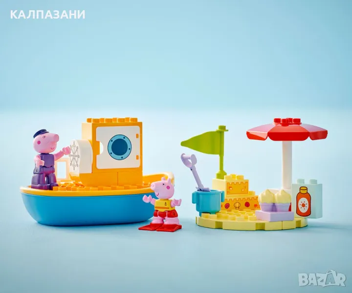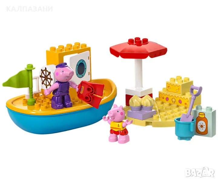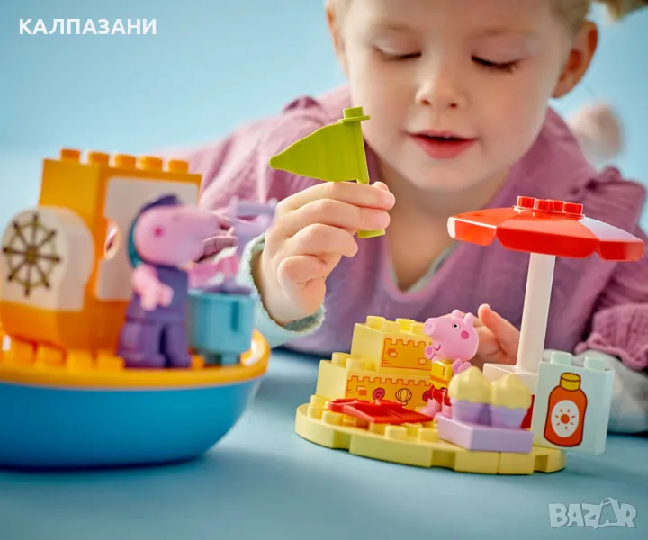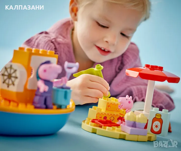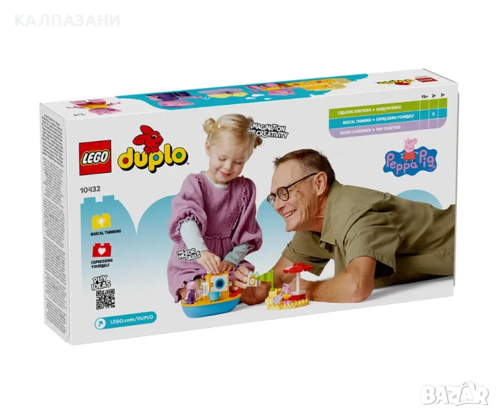 Всички деца на борда за LEGO® DUPLO® Пътуването с лодка на Пепа (10432) и часове забавно учене! Момичетата и момчетата на възраст над 2 години се присъединяват към фигурите на Дядо Прасенце и Пепа на плажа за пътешествие с лодка. Тази играчка за построяване и промяна идва с много творчески аксесоари, които да вдъхнат въображение за разказване на истории на малките деца. Те помагат на Пепа да си сложи слънцезащитен крем преди да се отправи на лов за мидички и усъвършенстват своите умения за подреждане, докато построяват пясъчния замък. Ако слънцето е твърде силно, Пепа може да се скрие под чадъра или да поплува, а децата упражняват своята координация между ръце и очи и фините двигателни умения, докато ѝ помагат да си сложи плавниците. Децата също могат да се разхладят във водата: този комплект с лодка плава, така че те могат да се радват на часове весело плискане с тази водна играчка. Играчките LEGO DUPLO с Пепа за деца са предназначени да подпомогнат ученето в предучилищна възраст, като помагат на малките деца да мислят логически и творчески, докато изграждат историята и имитират сцени от ТВ сериала.