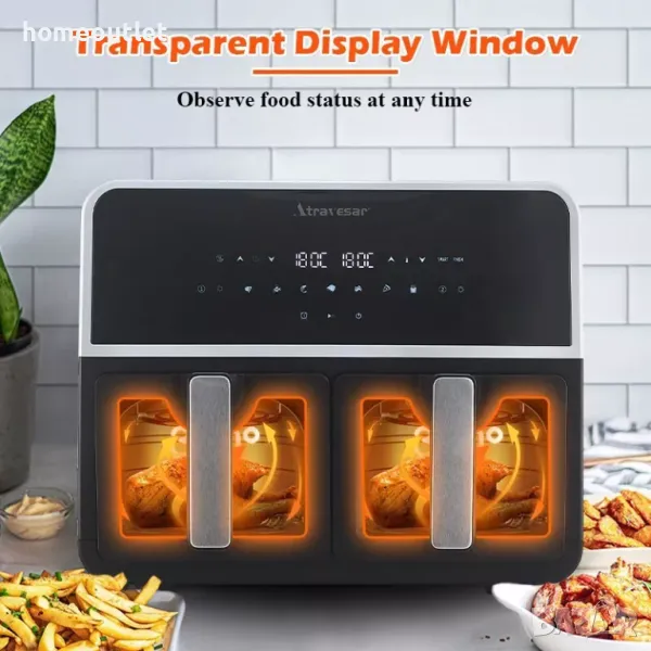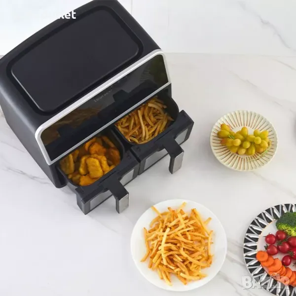 Капацитетът на този компактен въздушен фритюрник е 4,5+4,5 литра, може да побере 3-4 кг пържени картофи, 8 пилешки гърди или около 3 кг пиле.