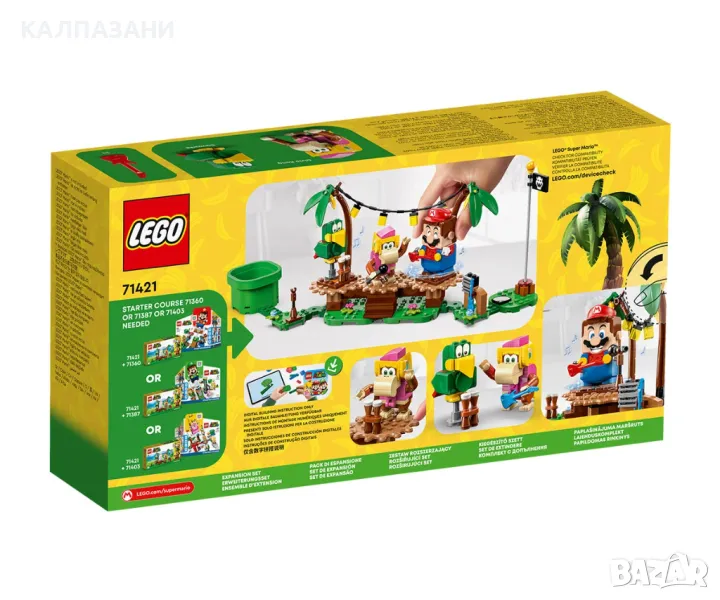 Децата могат да се впуснат в джунглата на Donkey Kong за музикално забавление с LEGO® Super Mario™ Комплект с допълнения Dixie Kong's Jungle Jam (71421). Той включва фигурите на Dixie Kong и папагала Squawks, сцена за конструиране, пейзаж от джунглата и музикални инструменти и оборудване. Поставете LEGO® Mario™, LEGO® Luigi™ или LEGO® Peach™ (фигурите не са включени) в центъра на сцената и ги завъртете, за да накарате свързаните сценични платформи да се въртят и да активират музикални звуци. Забележка: за интерактивна игра е необходима начална писта 71360, 71387 или 71403. Придружаващо приложение Изтеглете приложението LEGO Super Mario за инструкции за построяване и други забавни неща за подобряване на творческото изживяване на малките деца. Идея за подарък Колекционерският комплект за игра е страхотен подарък за креативни деца над 7 години, които обичат музиката и животните – и възрастни, които си спомнят с носталгия Donkey Kong, също ще го харесат!. Този и многото други комплекти с допълнения LEGO Super Mario позволяват на феновете да разширяват, да променят конфигурацията и да създават собствени уникални нива за часове игра със събиране на монети.