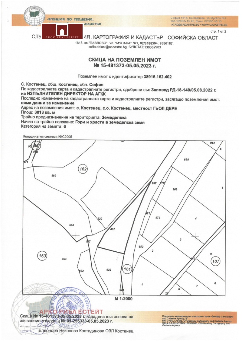 ARCO REAL ESTATE, предлага земеделска земя с големина от 3013 кв.м. с.Костенец, местност Гьол Дере