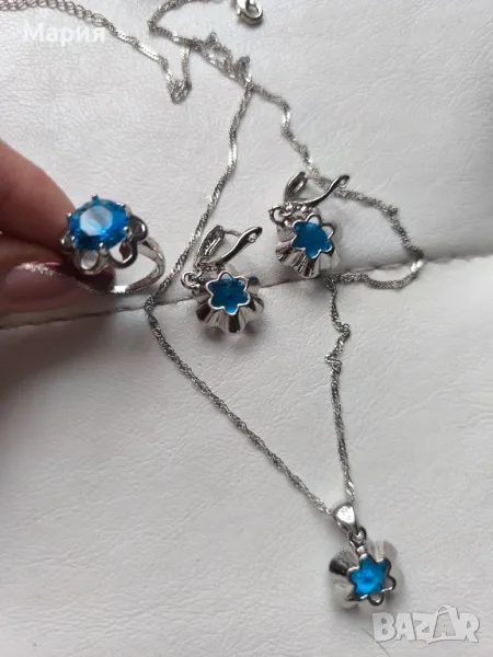 Сребърен комплект със сини, прозрачни кристали - синджир, обеци, висулка и пръстен. печат 925