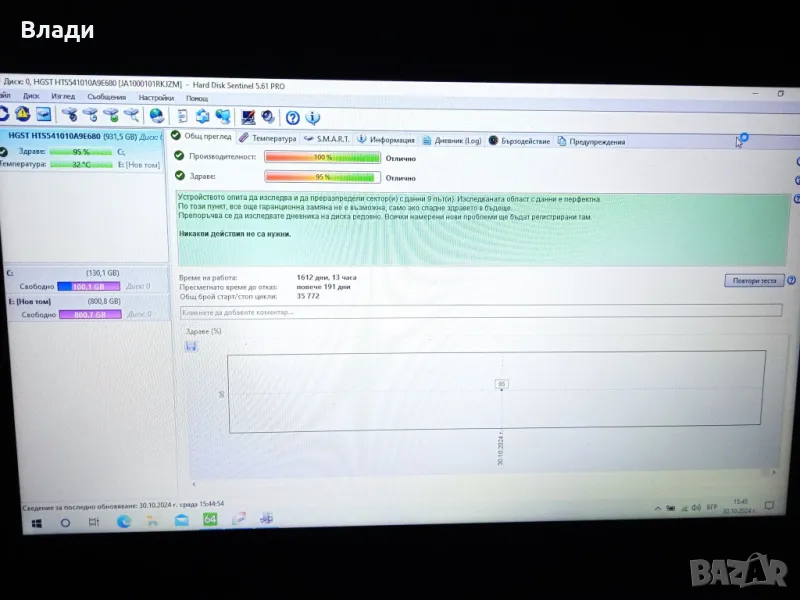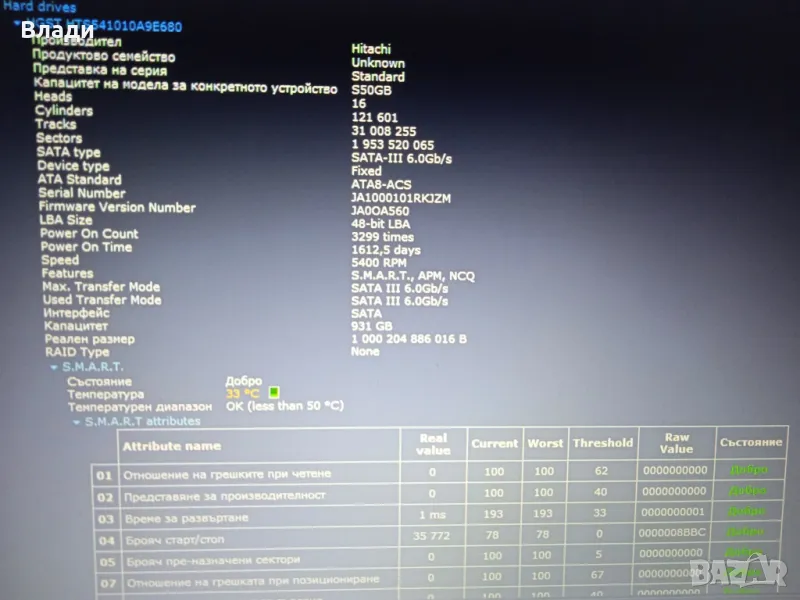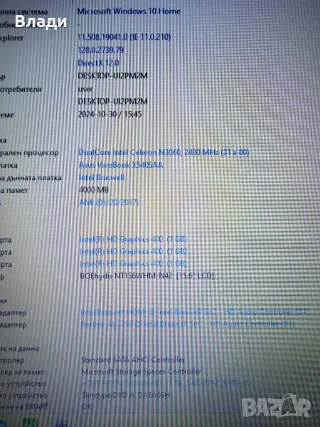 Инсталиран с Windows 10 Home 64 bit,HDD Sentinel,Speccy и Aida 64,за да се тества преди да се плати.