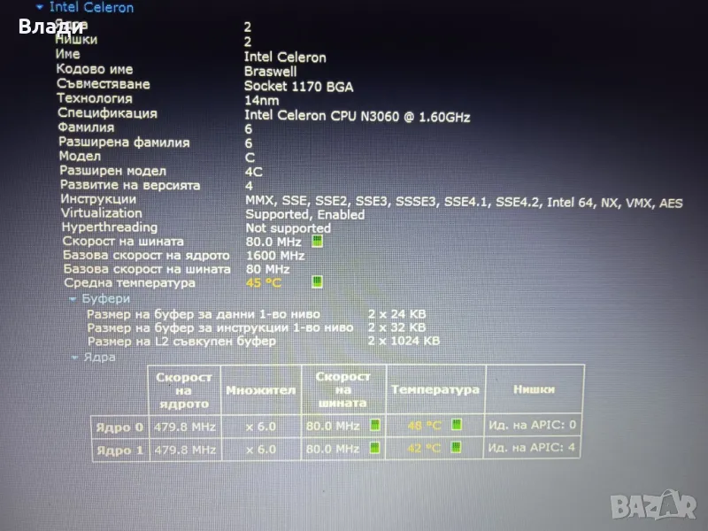 Процесор Intel Celeron N3060 (2-ядрен, 1.60 - 2.48 GHz, 2MB кеш)
