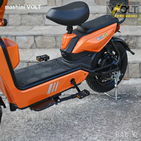 Двуместен електрически скутер- велосипед с педали BULLMAX BUZZ. с големи 16" джанти, 750W максимална мощност на двигателя, 220кг. товароносимост, 50+ км. пробег. Не е необходима шофьорска книжка и регистрация в КАТ.