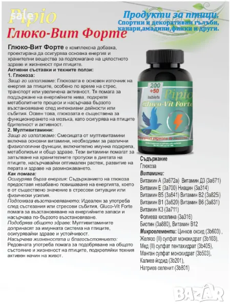 Като добавка продукта Глюко-Вит Форте е предназначен да подпомага бързото възстановяване на птиците след полет,преумора ,боледуване , натоварване на организма.