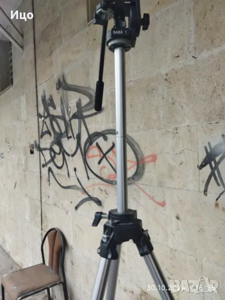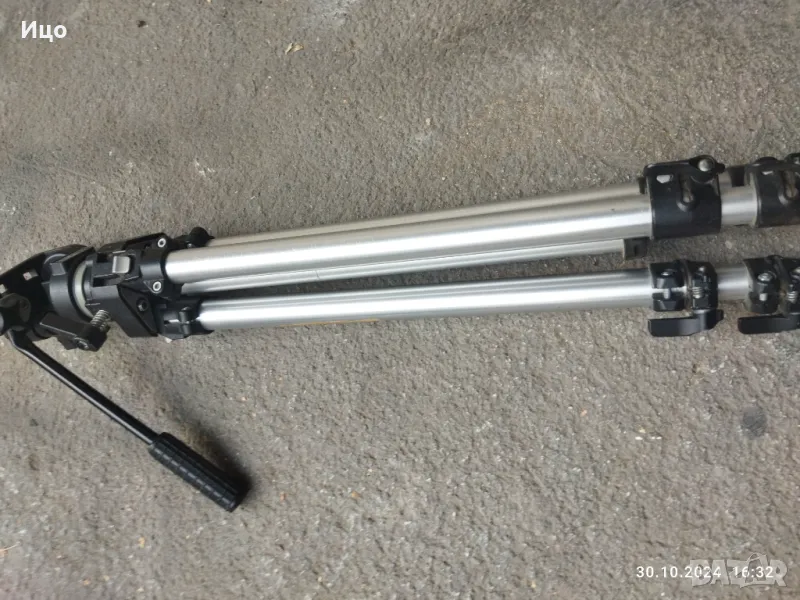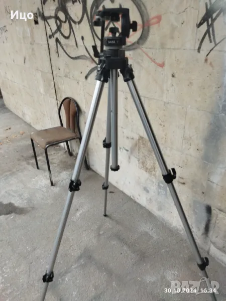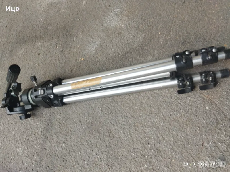 Много стабилна тринога,с телескопични застопоряващи се крака.Максимална височина в разпънато състояние 190-200 см.Минимслна височина прибрани крака 75 см.Добър външен вид.