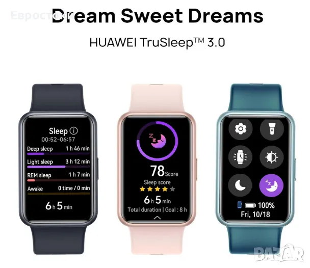 Сладки сънища с HUAWEI TruSleep™ 3.0. Точността на разпознаване на съня е увеличена с 10% и можете да проверите резултата си от съня и многоизмерната метрика на съня директно в смарт часовника HUAWEI WATCH FIT Special Edition. Новият режим на заспиване предоставя функцията „Не ме безпокойте“ и функциите за настройка на времето, като пази вашата страна на мечтите.