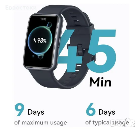 Батерията, коята работи. HUAWEI WATCH FIT Special Edition може да издържи до 1 ден при петминутно бързо зареждане и да се зареди до капацитет само за 45 минути, което е с 30% по-бързо. След пълно зареждане може да се използва до 9 дни или 6 дни при типични сценарии на използване.