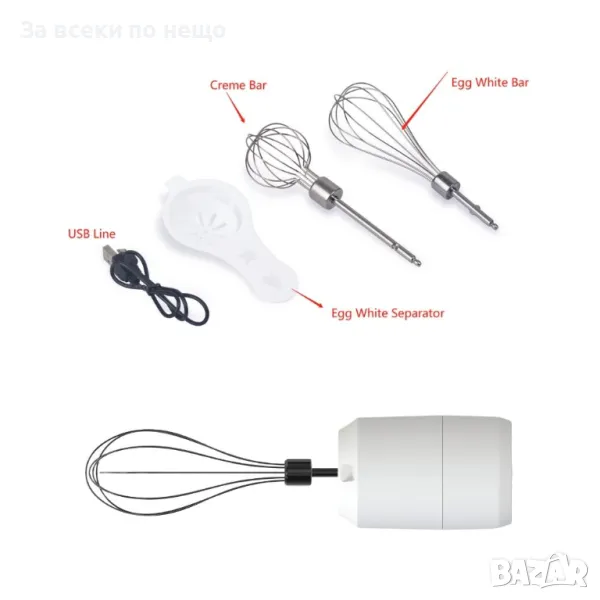 * Аксесоари: 50см USB кабел за зареждане, сепаратор за белтък, 2 разглобяеми миксера от неръждаема стомана; крем бар, яйчен белтък