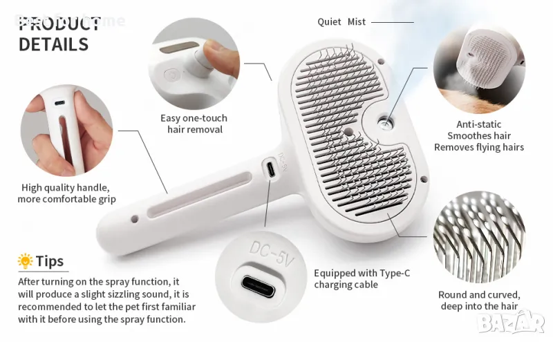 【Четка за котки с пара 3 в 1】 Четка за котки с пара комбинира косми, самопочистване и функции на пара за ефективно премахване на разхлабени и заплетени косми и почистване на праха по повърхността на вашия домашен любимец просто и бързо. Забележка: Четката Steam Cat само превръща водата в мъгла и не я нагрява.