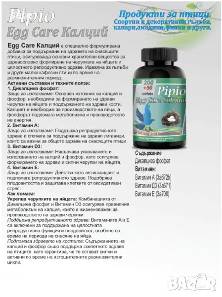 Като добавка продукта Egg Care Калций спомага доброто развитие на черупката на яйцата. Спомага предпазването от спазми и парализи.