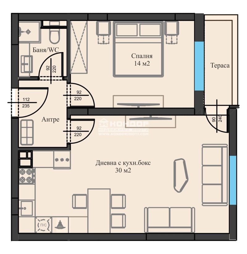 Разпределения - Предлагаме на Вашето внимание слънчев, вътрешен апартамент, състоящ се от дневна с трапезария и кухненски бокс - 30 м2, една самостоятелна спалня 14м2, баня с тоалетна, входно антре и тераса.