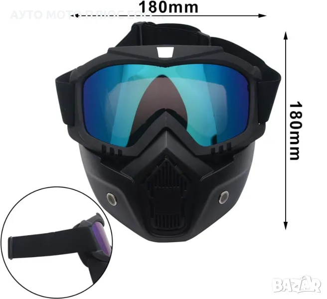 Маската се сваля от очилата и може да се ползва отделно. Регулируемата еластична лента е стабилна и гъвкава, лесна за носене. Подвижна маска за дишане с дупки за добра филтрация на прах и пясък за максимално гладко дишане. Система против изпотяване,от двете страни са предвидени отвори за осигуряване на вътрешна циркулация на въздуха. Рамката е здрава и устойчива на удар. Плаката е устойчива на надраскване и предпазва от слънчевите лъчи. Плътно прилепваща вътрешна подплата.
