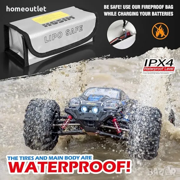 Четирите колела на водоустойчивата кола с дистанционно управление са монтирани с независими пружини за окачване, което позволява на тялото на автомобила да бъде по-гъвкаво и играе удароустойчива функция, за да защити електронните компоненти вътре в каросерията.