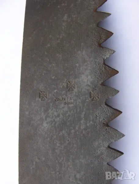 Класически старинен професионален трион за дърво тип джага произведен от високовъглеродна стомана преди повече от век, историческо наследство от епохата на кайзерова Германия. Колекционерска рядкост с маркировка "JOH.PET.MÜLLER SÖHNE" с 3 щемпели тип “Железен Кръст“ (лапа) - маркировката се е използвала от 1867 до 1908 г. За допълнителна информация посетете www.holzwerken.de/museum/hersteller/mueller_johann_peter.phtml ;