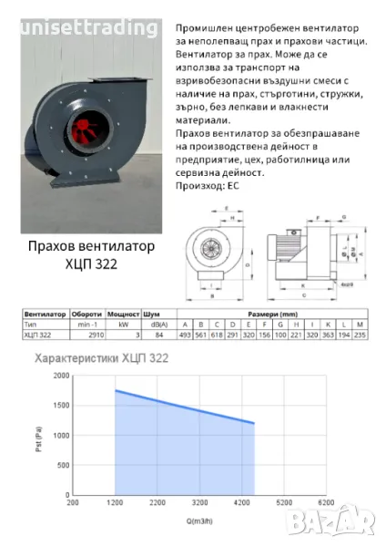 Промишлен центробежен вентилатор за неполепващ прах и прахови частици.