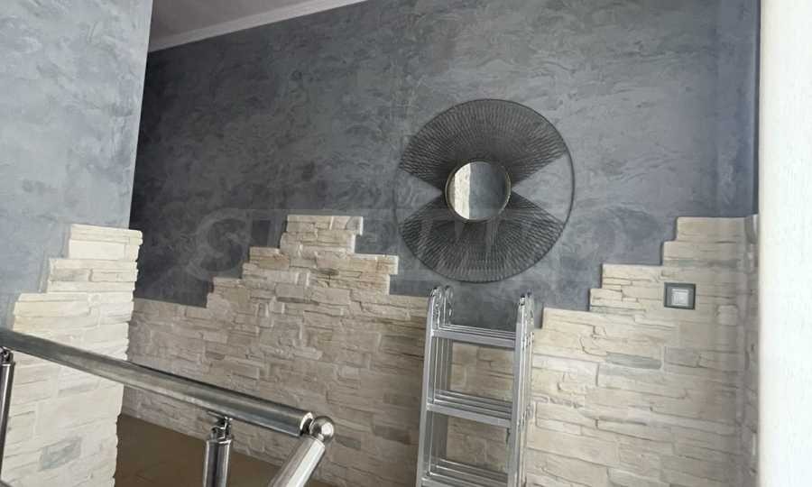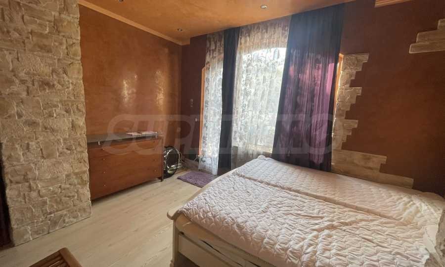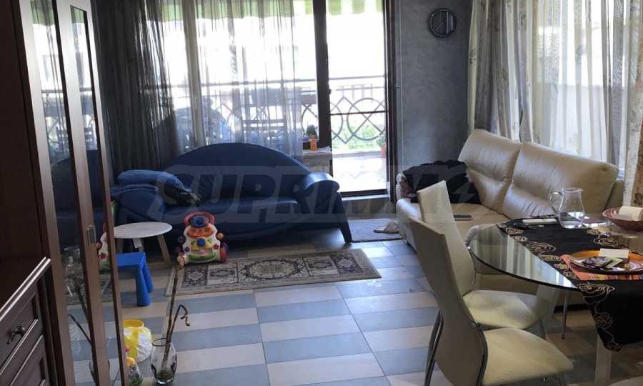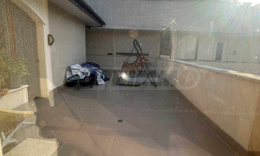 втори етаж - голям коридор, който води до две големи спални и разбира се, частично остъклена тераса, която е с три входа, от коридора и двете спални. На втория етаж се намира модерна баня с тоалетна.Жилището е напълно обзаведено и оборудвано с всичко необходимо за едно домакинство като мебели и ел. уреди, техника, климатици, готово за живеене или отдаване под наем. Всяка стая се отоплява с климатик, но тъй като изложението е източно, е изключително топъл. Напълно подходящ е за семейство, търсещо спокойствие през зимата и плаж и забавления през лятото.
