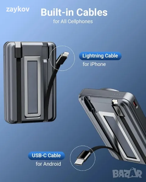 Вградени кабели и стойка: Снабден с USB Type C и Lightning кабел, ви позволява да зареждате телефона си, ако не поддържа безжично зареждане. Преносимото безжично зарядно за iPhone със сгъваема стойка държи телефона ви за лесно гледане. Тънкият и лек дизайн не блокира обектива на камерата. Перфектен размер за пътуване, пасва идеално в джоба, чантата или раницата ви, дори ако е просто ежедневна захранваща банка.