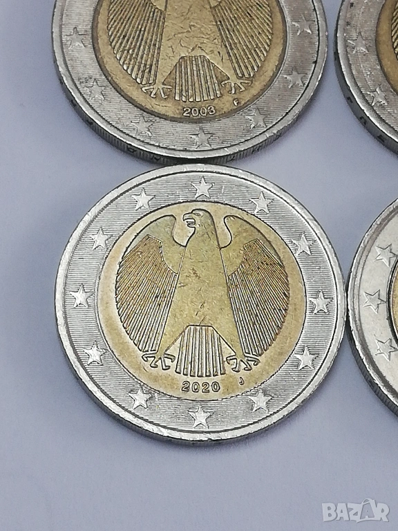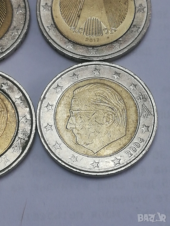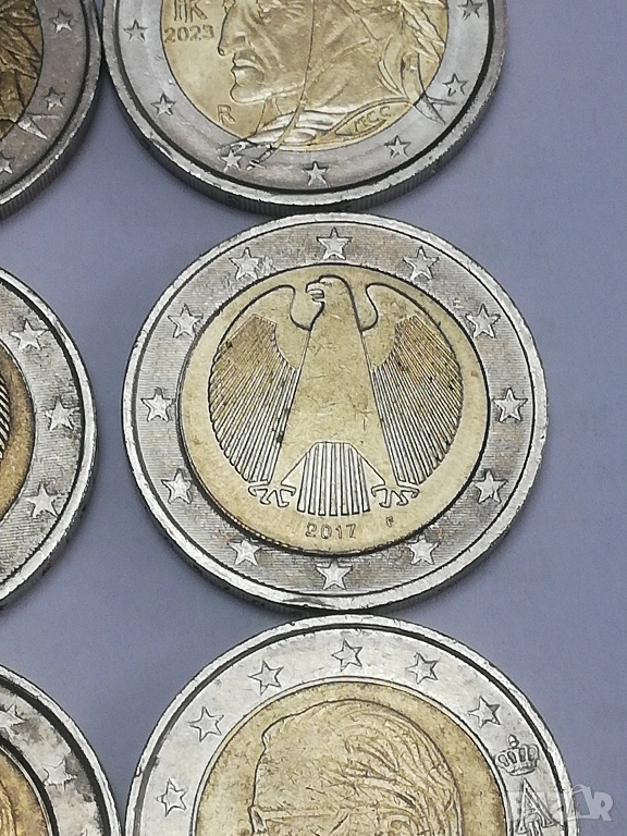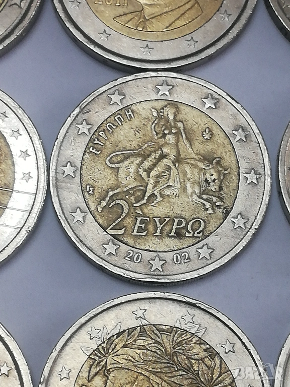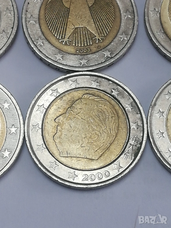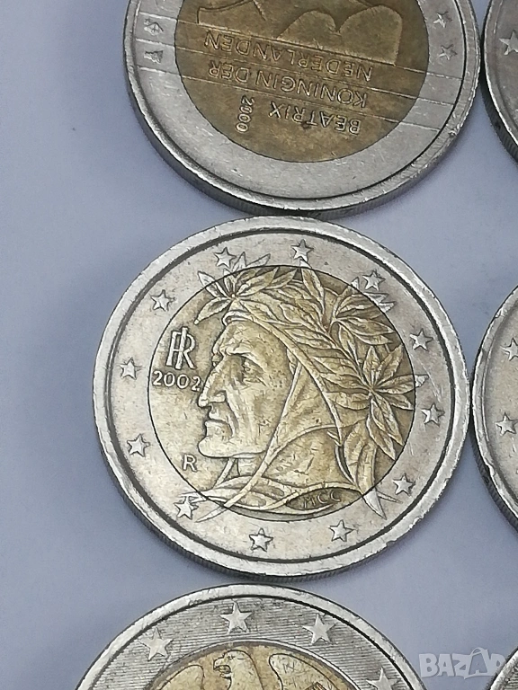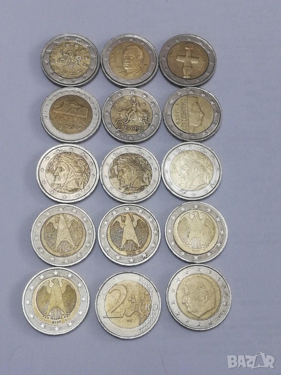 лот от 15 монети по 2 евро различни държави и години. в прилично състояние, монетите са в масово обращение от началните години три монети от Италия-2002;2005 и 2023 г.;една монета от Люксенбург от 2004 г.една монета от Кипър от 2018 г.;една монета от Португалия от 2002 г;една монета от Гърция 2002 г. без буква,две монети от Белгия-2000 г. и 2004 г.; четири монети от Германия две от 2003 букви-F;J;2017 буква -F и 2020 буква J;една монетa от Испания от 2011 г. и една от Холандия от 2000 г. цена 4 евро за брой.при закупуването на целият лот, единични бройки по договаряне между 4-8 евро в зависимост от каталожната цена. тези монети по каталог са отценени за над 120 евро . има много редки и ценни монети из между тях,за по подробни снимки и информация на лични.изпращам само по еконт.разполагам и с други 2 евро монети.всички описани монети са в наличност.