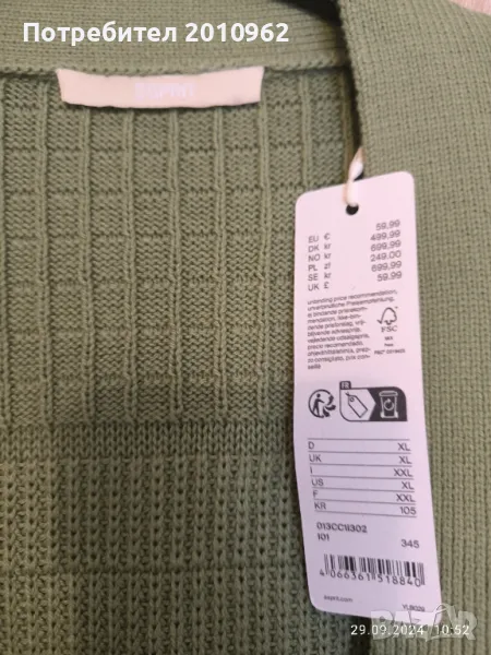 Дамска жилетка, дълга без копчета. Есприт.Чисто нова ,с етикет.Купувана от сайта. 60/40 памук и акрил. Размер XL, уголемена е според мен.