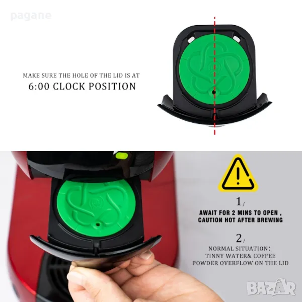 - ВАЖНО е да спазите посоката на дупката на капсулата - тя трябва да е в посока към вас (посока 6 часа), като я поставяте в машината за да попадне иглата правилно в леглото й.